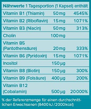 Thiaminhydrochlorid (Vitamin B1), Riboflavin-Hydrochlorid (Vitamin B2), Niacin (Vitamin B3), Cholin, Calcium-D-Pantothenat (Vitamin B5), Pyridoxin-Hydrochlorid (Vitamin B6), Inositol, D-Biotin (Vitamin B8), Folsäure (Vitamin B9), Cyanocobalamin (Vitamin B12), Trennmittel: Magnesiumstearat, Kapselhülle: Hydroxypropylmethylcellulose